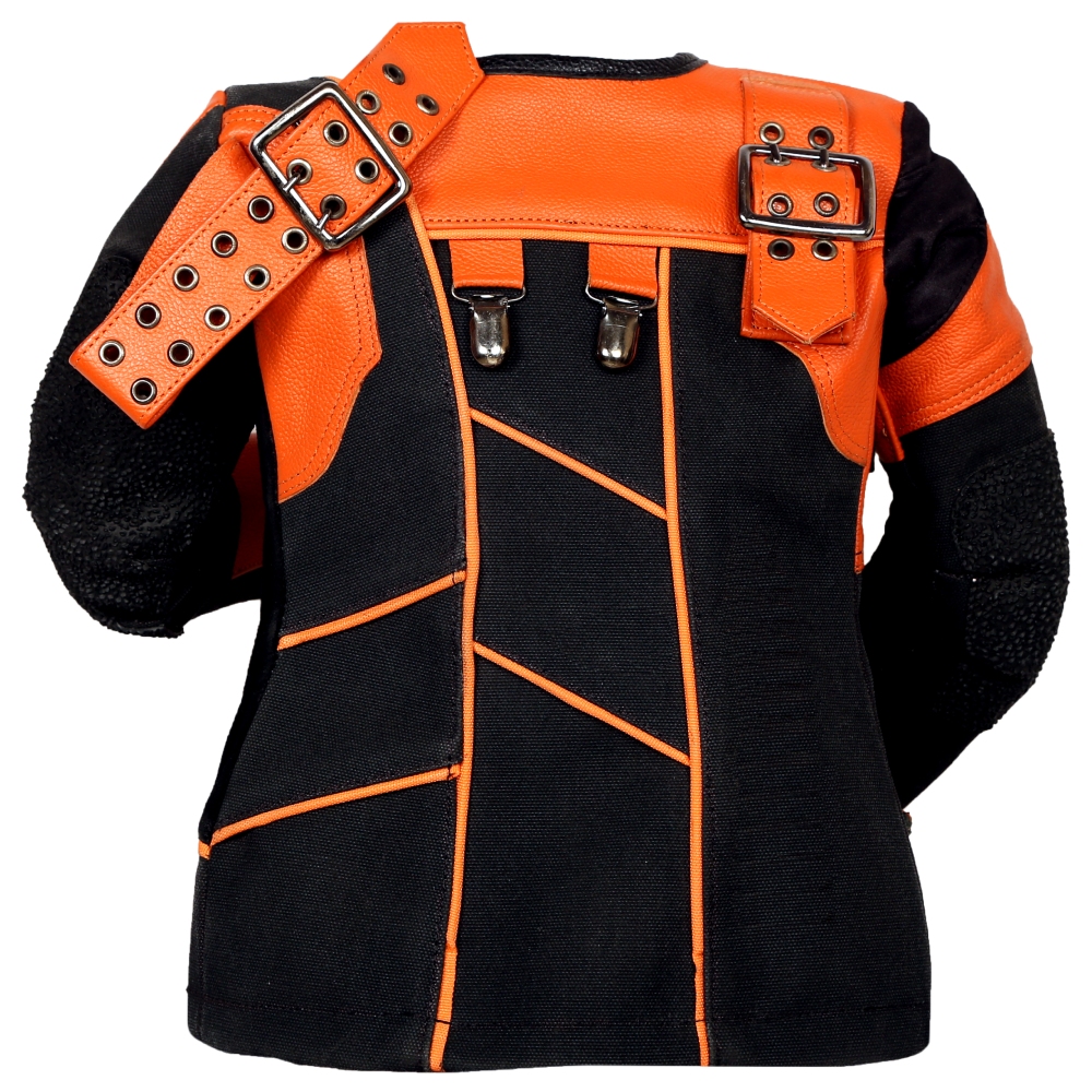 P10 Hybrid jacket fully made up to polyster material and leather, back panel gives extra support to the shooters. The Hybrid 6 button model has slight curve fitting near neck which is helpful in prone position.
